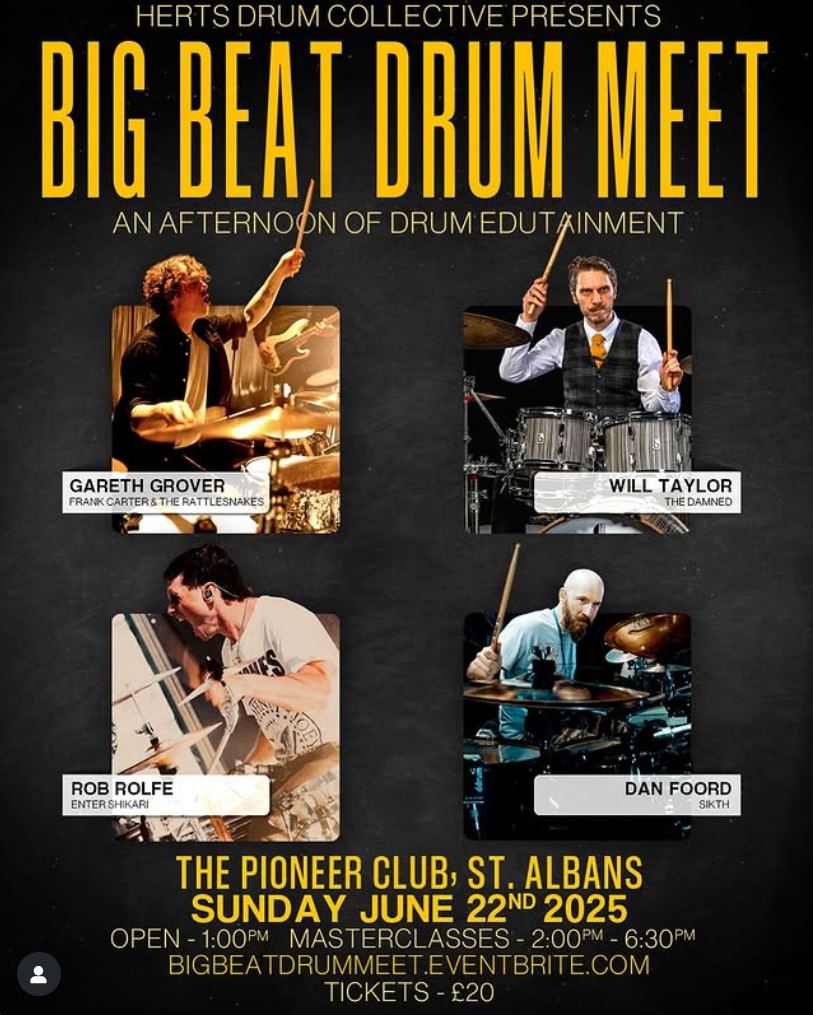 The Herts Drum Collective presents an afternoon of drum edutainment – 1 p.m. to 6:30 p.m. at The Pioneer Club, St. Albans